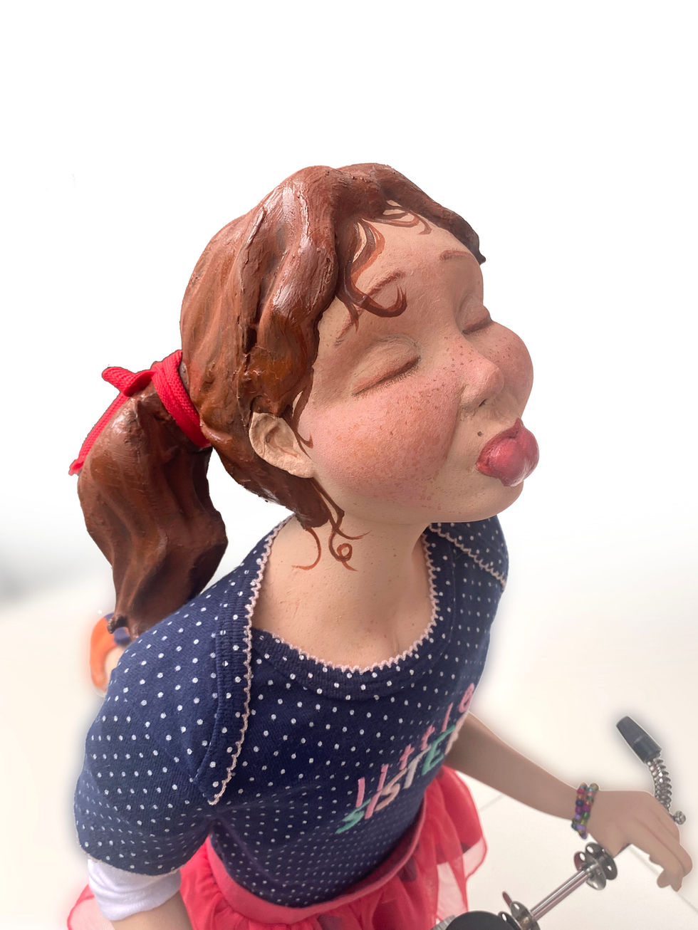 Oeuvre créée en grande partie avec une machine à coudre Singer vintage. Le personnage développé et imprimé 3D peint à la main est habillé avec du matériel recyclé.